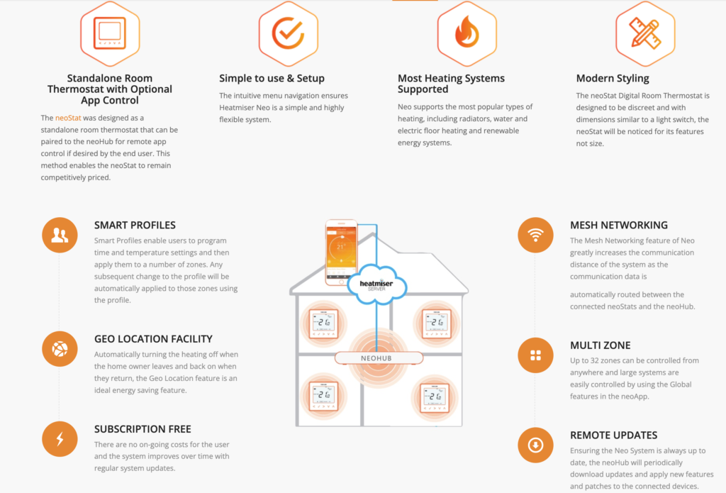 The neoStat was designed as a standalone thermostat that can be paired to the neoHub for remote app control if desired by the end user. This method enables the neoStat to remain competitively priced.
